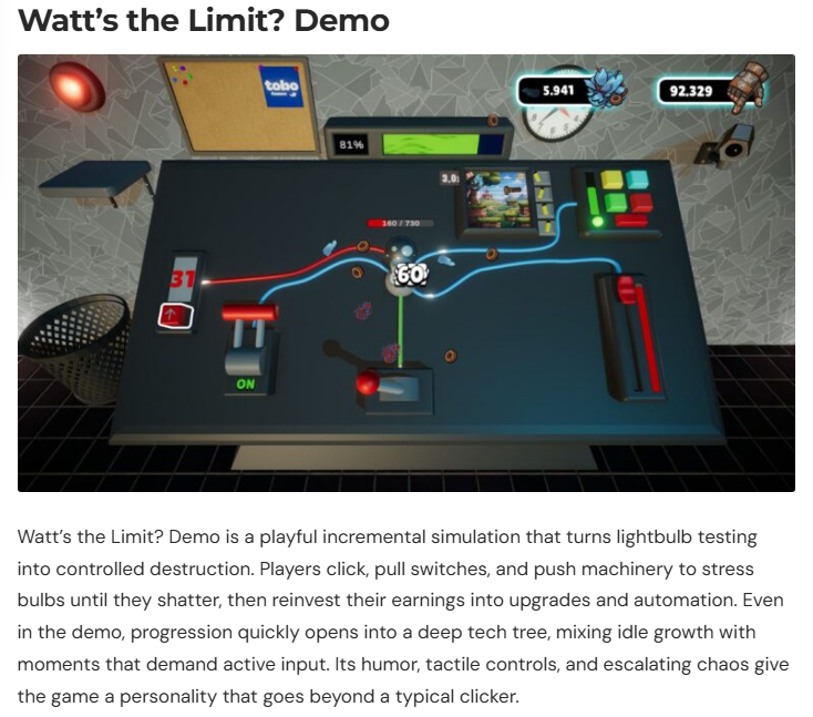 Watt’s the Limit? was featured in Gamesardor’s “Top Steam Games to Lookout for January 2026” article, highlighting upcoming Steam titles to watch this month.